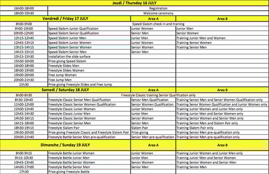 To be confirmed and reorganized according to the registrations. Disciplines can be moved to another day. / Le programme prévisionnel doit être confirmé, il sera ajusté en fonction des inscriptions. Les disciplines pourront être décalées à un autre jour du week end.
