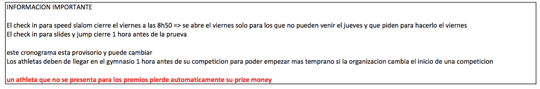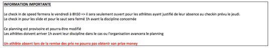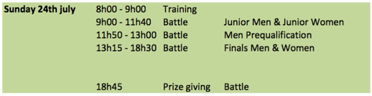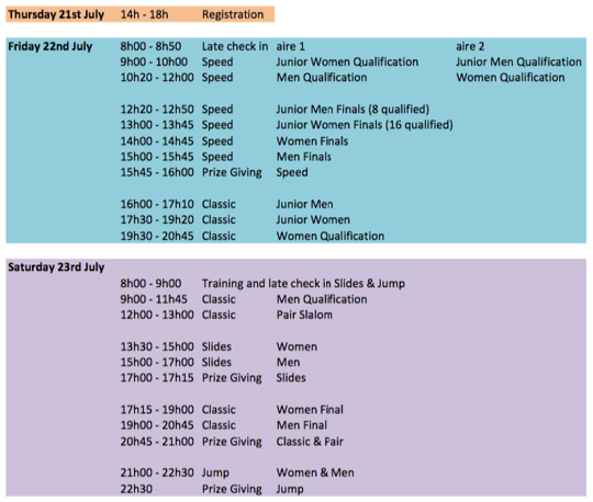 To be confirmed and reorganized according to the registrations. Disciplines can be moved to another day. / Le programme prévisionnel doit être confirmé, il sera ajusté en fonction des inscriptions. Les disciplines pourront être décalées à un autre jour du week end.