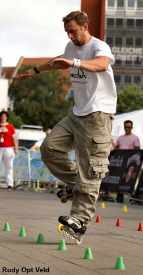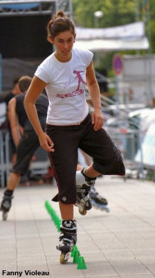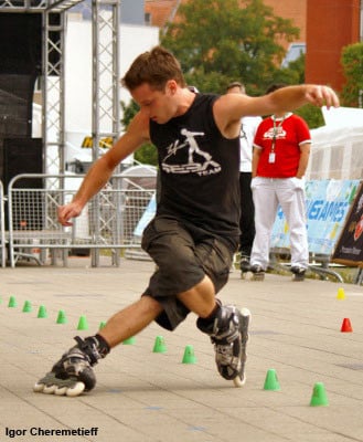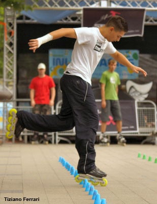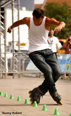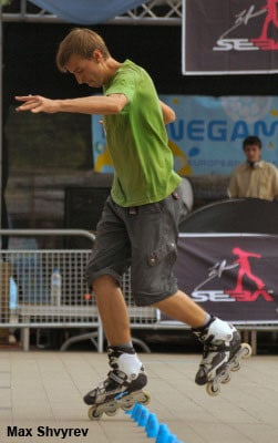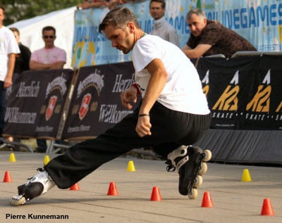 Mischa will always surprise me with his capacity to swallow the 20 cones of the line at a hallucinating speed… beside his execution speed, Mischa has other assets: an excellent mastery of chicken legs (three turns… easy!) and original but none the less technical tricks (frontwards heel Korean spins, real frontwards reverse nelsons – the foot in the back in the position on an internal wiper…) Rather surprising discrepancy when you realize that the guy can hardly manage a few cones doing wheeling!