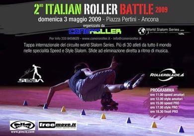 After Battle Rome on the 8th of last March, the Italians seem to find the motivation to organize Battles: The second Italian battle of 2009 was in Ancona (a small town on the East coast) on May 2. It was a Basic event (one cone), very friendly: it was a good opportunity for the Italians to meet and share a day of skating in the sunshine. There were about thirty competitors, exclusively Italians, amongst whom Luca Ulivieri, Savio Brivio, Daniele Lenzi, Francesco Masseli… (but the only regular, Tiziano Ferrari was missing) – not to forget a few French intruders of the SebaTeam (Seba, Chloé Seyrès, Igor Cheremetieff, and Xuan Le).
