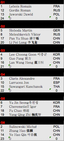 The Men's landscape has changed even more that the Women's since last year. Polish Michal Sulinowski (#3) will make his first appearance in the closed sphere, Igor Cheremetieff (#8) is back in the game, as well as Russians Viktor Meleshkevich (#9) and Roman Gordin (#13). All these comers throw out several personalities, including Singaporean Clarence Cheung and Chinese Fu Chao and Liao Jie.