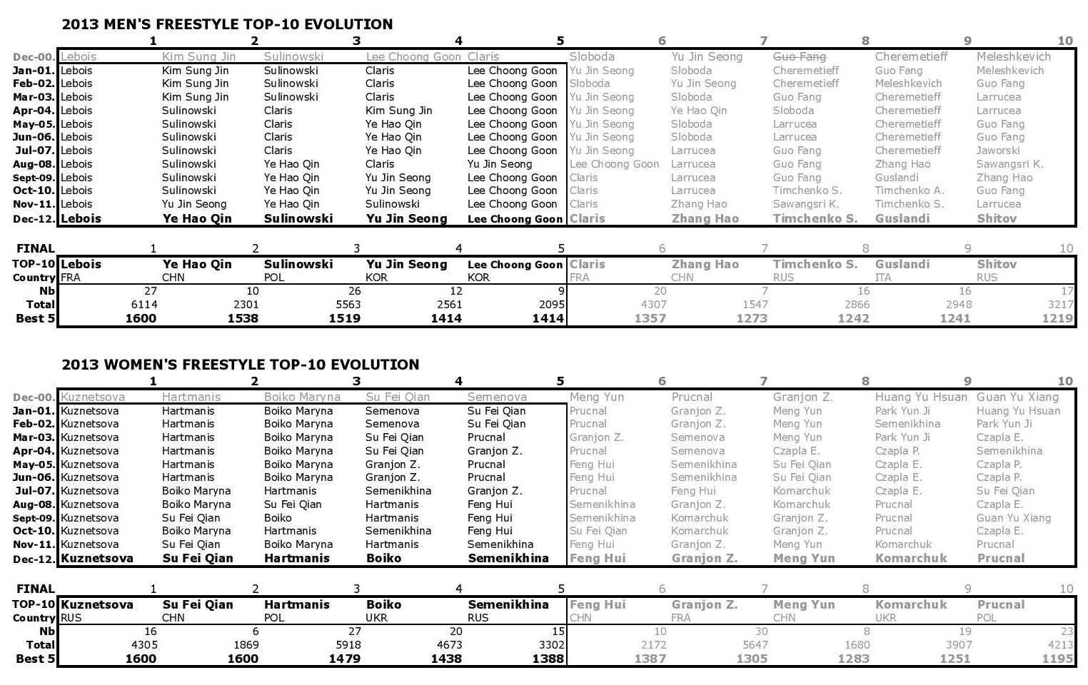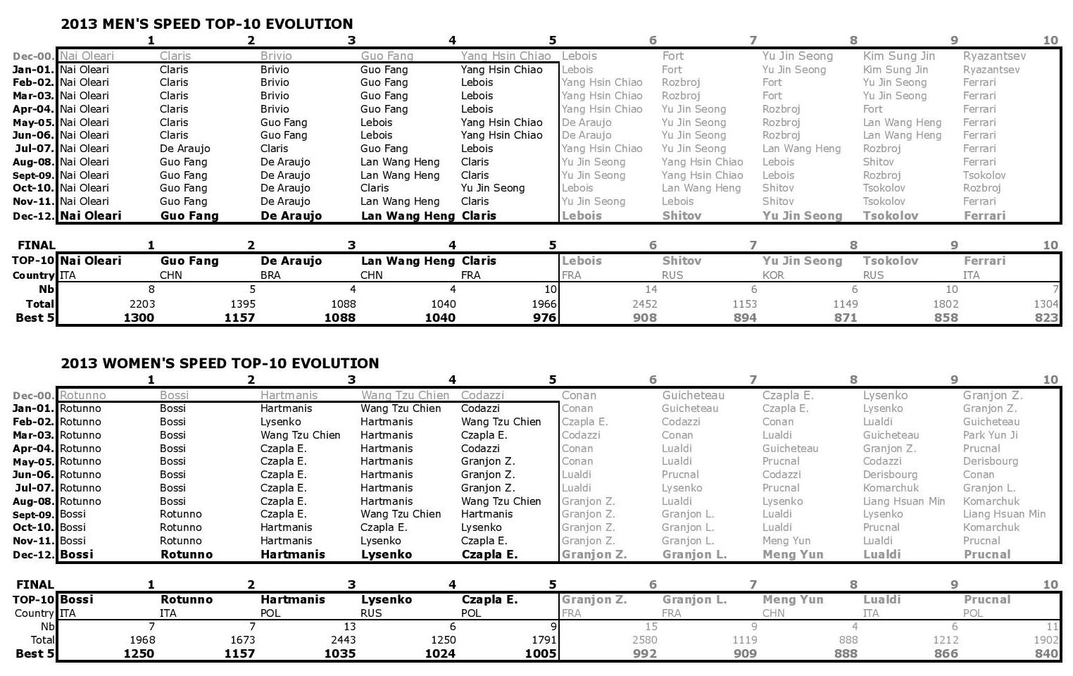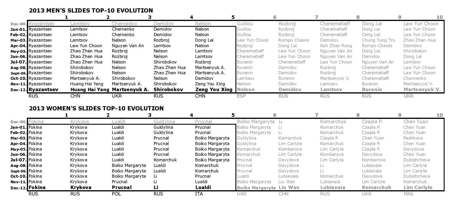 The Chinese dangerously make room for themselves, though. Let's note that the Men's #2 place was challenged by Chinese ZHAO ZHEN HUA for three months, and especially by HUANG HAI YANG thanks to his win at the World Championships of Taipei, who finishes the year on the heels of Rekil. The Women's Top-5 has not yet been reached by a single Asian slider, but LIU WAN, the 2013 World Champion, is getting closer and is currently at the #7 place.
