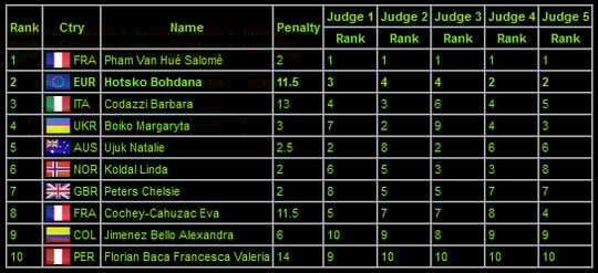 Ukrainian Margaryta Boiko took the last spot, despite a poor footwork and messy trick endings, leaving Australian Natalie Ujuk, who may have lacked a little pure technical highlight but provided